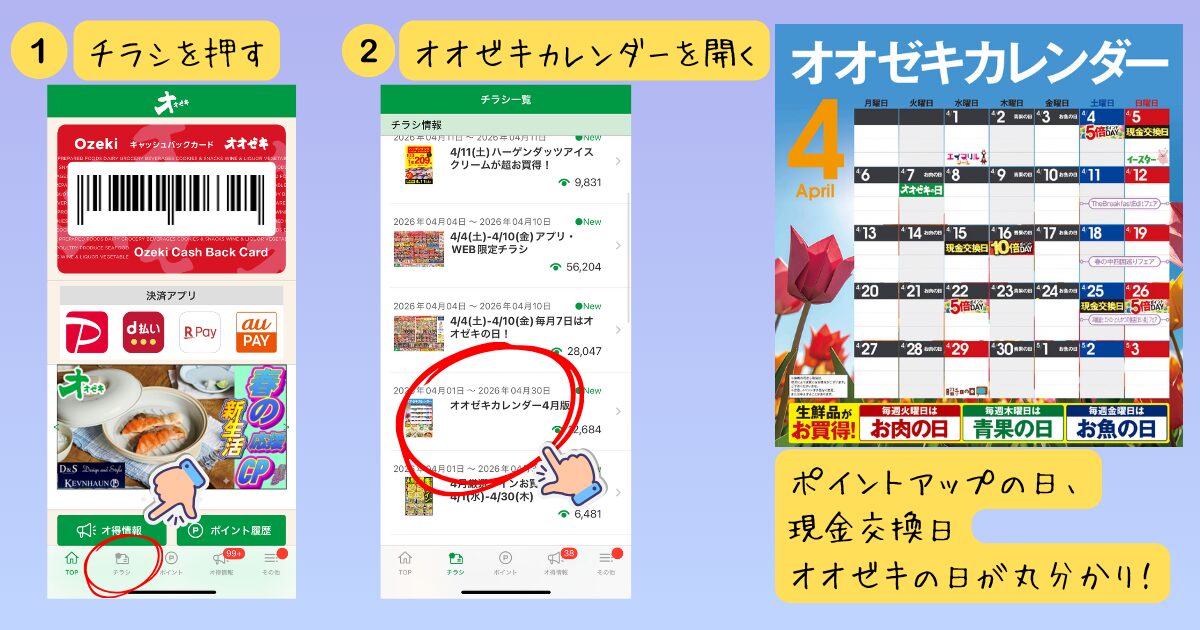 アプリの「チラシ」から「オオゼキカレンダー」を開いて、お得な日を一目で確認できます。