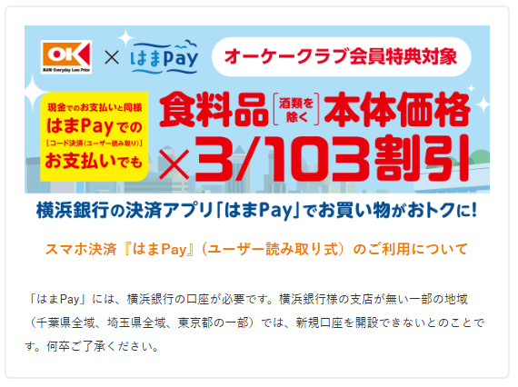 今は「はまPay」(横浜銀行の決済アプリ)での支払いのみ、オーケークラブ会員の本体価格3/103(約3%)割引と併用可能ですが、これも今年中には終わるようです。(店内ポップの情報より)