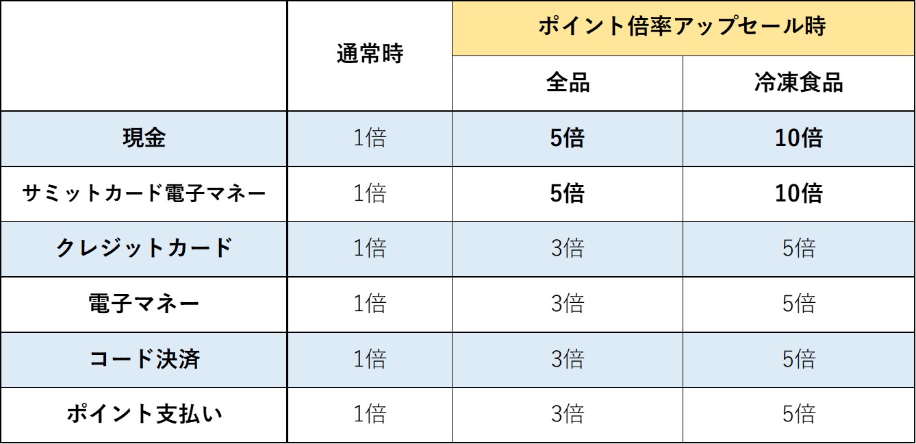 ポイント倍率アップセール:全品対象の日は現金決済とサミットカード電子マネー決済で5倍(2.5%)、その他の支払い方法で3倍(1.5%)ポイント付与