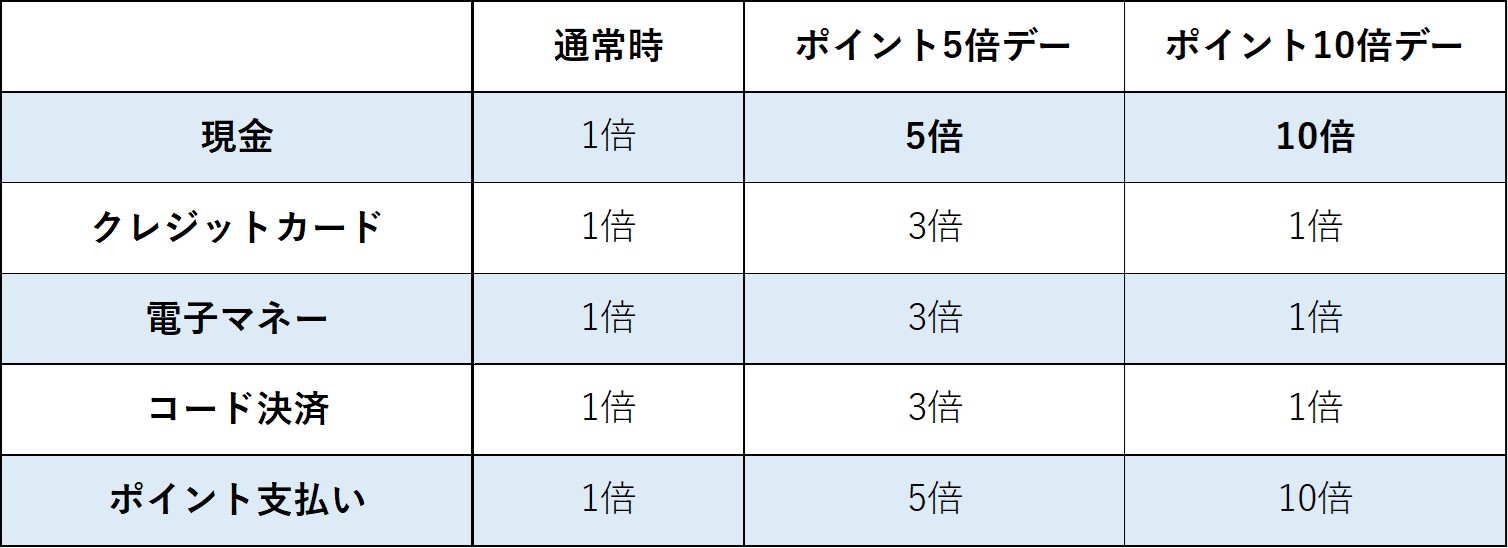 ポイント10倍デー:現金支払いで10倍ポイント付与。(10%)