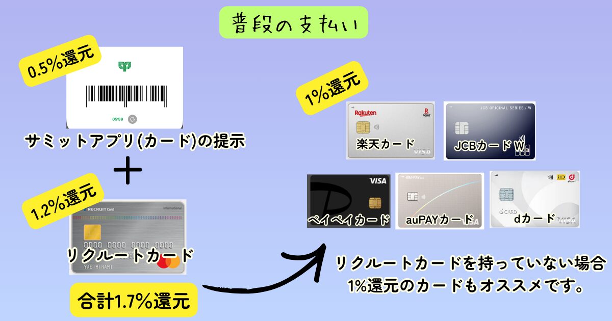 普段:「サミットアプリ」を提示したうえで、「リクルートカード」で決済をする